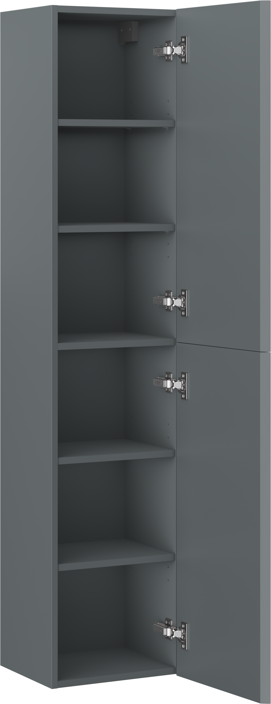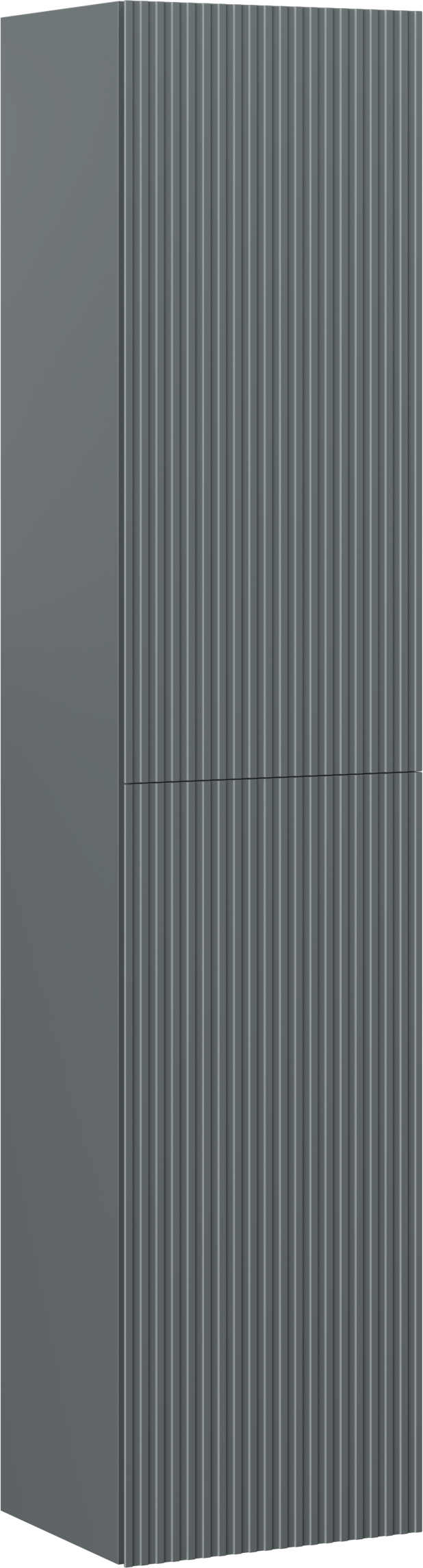 Specyfikacja produktu: Szerokość: 35 cm Wysokość: 160 cm Głębokość: 30 cm Kolor korpus: Grafit mat Materiał korpus: Płyta lakierowana Kolor front: Grafit mat Materiał front: Płyta MDF lakierowana Struktura frontu: Ryflowana Ilość drzwi: 2 5 półek (1 półka środkowa stała oraz 4 półki z możliwością regulacji) Zawiasy z funkcją cichego domyku Uniwersalny montaż drzwi (lewo/prawo) Powierzchnia odporna na promienie UV Produkt zmontowany