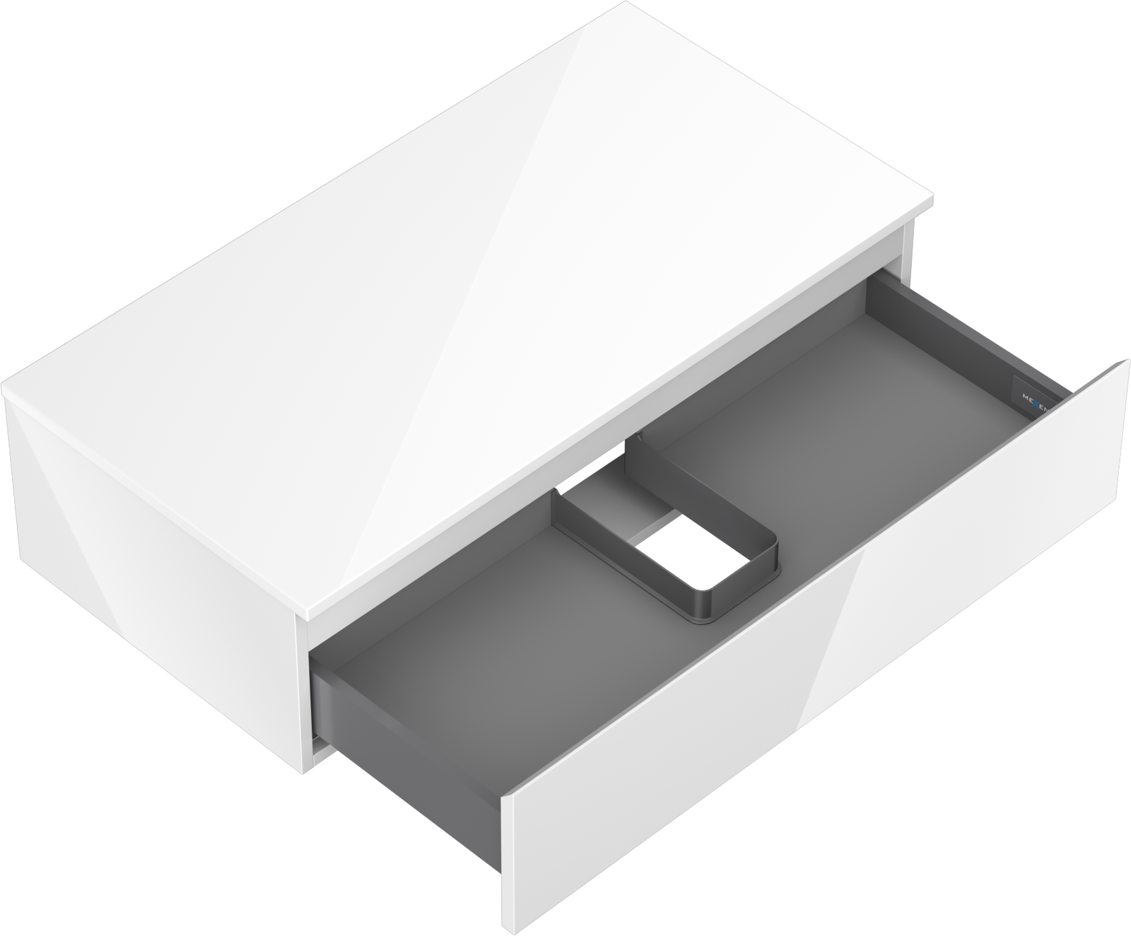 Wycięcie w szufladzie jest zaprojektowane w taki sposób, aby pomieścić syfon, który jest niezbędny w instalacjach umywalkowych. Dzięki temu mebel może być zamontowany w pełni funkcjonalnie, bez konieczności rezygnowania z przestrzeni w szufladzie na rzecz instalacji.