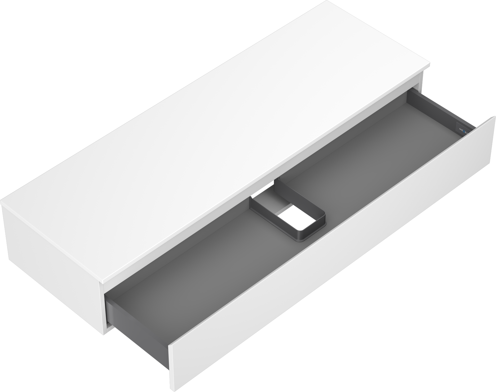 Wycięcie w szufladzie jest zaprojektowane w taki sposób, aby pomieścić syfon, który jest niezbędny w instalacjach umywalkowych. Dzięki temu mebel może być zamontowany w pełni funkcjonalnie, bez konieczności rezygnowania z przestrzeni w szufladzie na rzecz instalacji.
