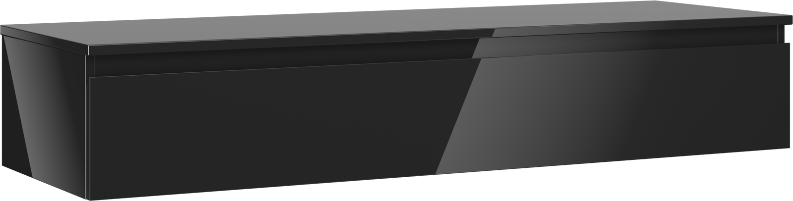 Specyfikacja produktu: Wymiary szafki: Szerokość: 140 cm Wysokość: 23,5 cm Głębokość: 46 cm Kolor korpus: Czarny połysk  Materiał korpus: Płyta lakierowana Kolor front: Czarny połysk Materiał front: Płyta MDF lakierowana Struktura frontu: Gładka Ilość szuflad: 1 Przestronna szuflada z funkcją cichego domyku Pełny wysuw ułatwiający dostęp do zawartości szuflad Powierzchnia odporna na promienie UV Wymiary blatu: Szerokość: 140,6 cm Głębokość: 46,5 cm Grubość: 1,8 cm Kolor blatu: Czarny połysk Materiał blatu: Płyta MDF lakierowana Powierzchnia odporna na promienie UV Idealny jako podstawa do umywalek nablatowych Produkt zmontowany