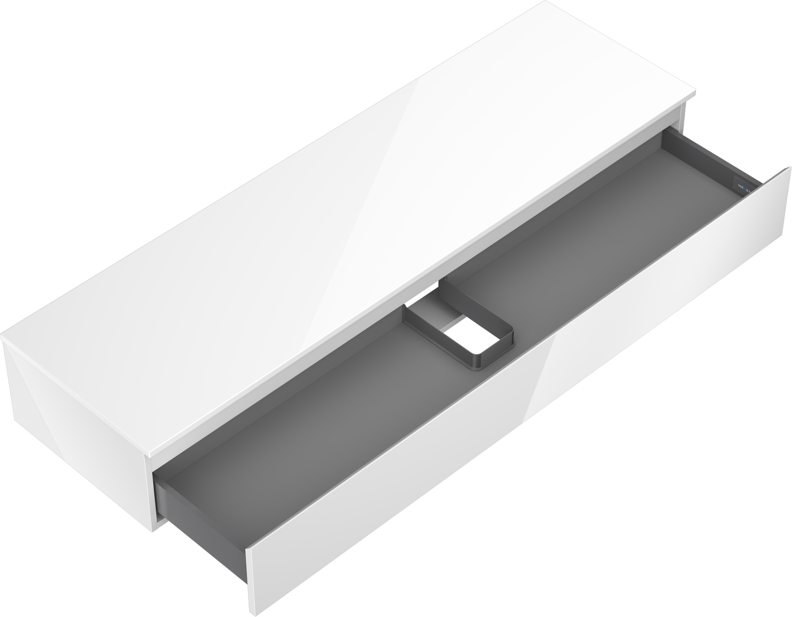 Wycięcie w szufladzie jest zaprojektowane w taki sposób, aby pomieścić syfon, który jest niezbędny w instalacjach umywalkowych. Dzięki temu mebel może być zamontowany w pełni funkcjonalnie, bez konieczności rezygnowania z przestrzeni w szufladzie na rzecz instalacji.