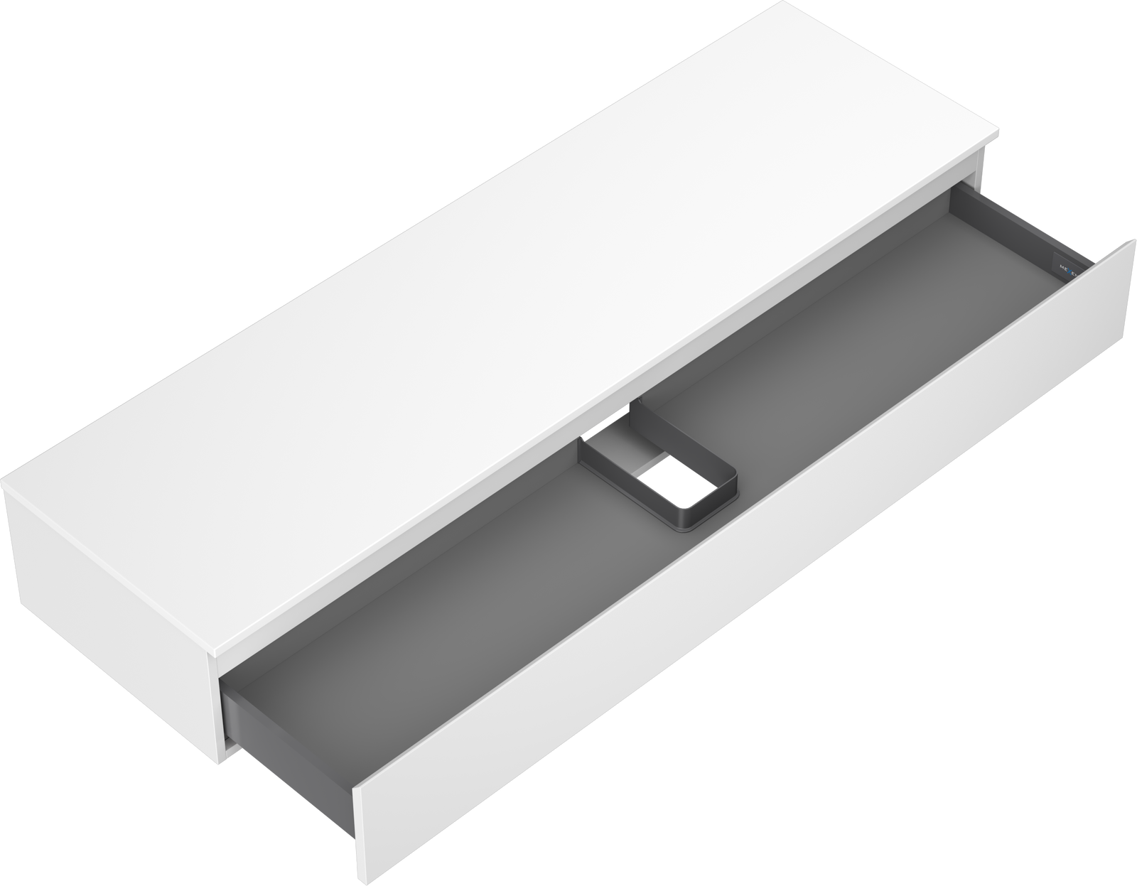 Wycięcie w szufladzie jest zaprojektowane w taki sposób, aby pomieścić syfon, który jest niezbędny w instalacjach umywalkowych. Dzięki temu mebel może być zamontowany w pełni funkcjonalnie, bez konieczności rezygnowania z przestrzeni w szufladzie na rzecz instalacji.