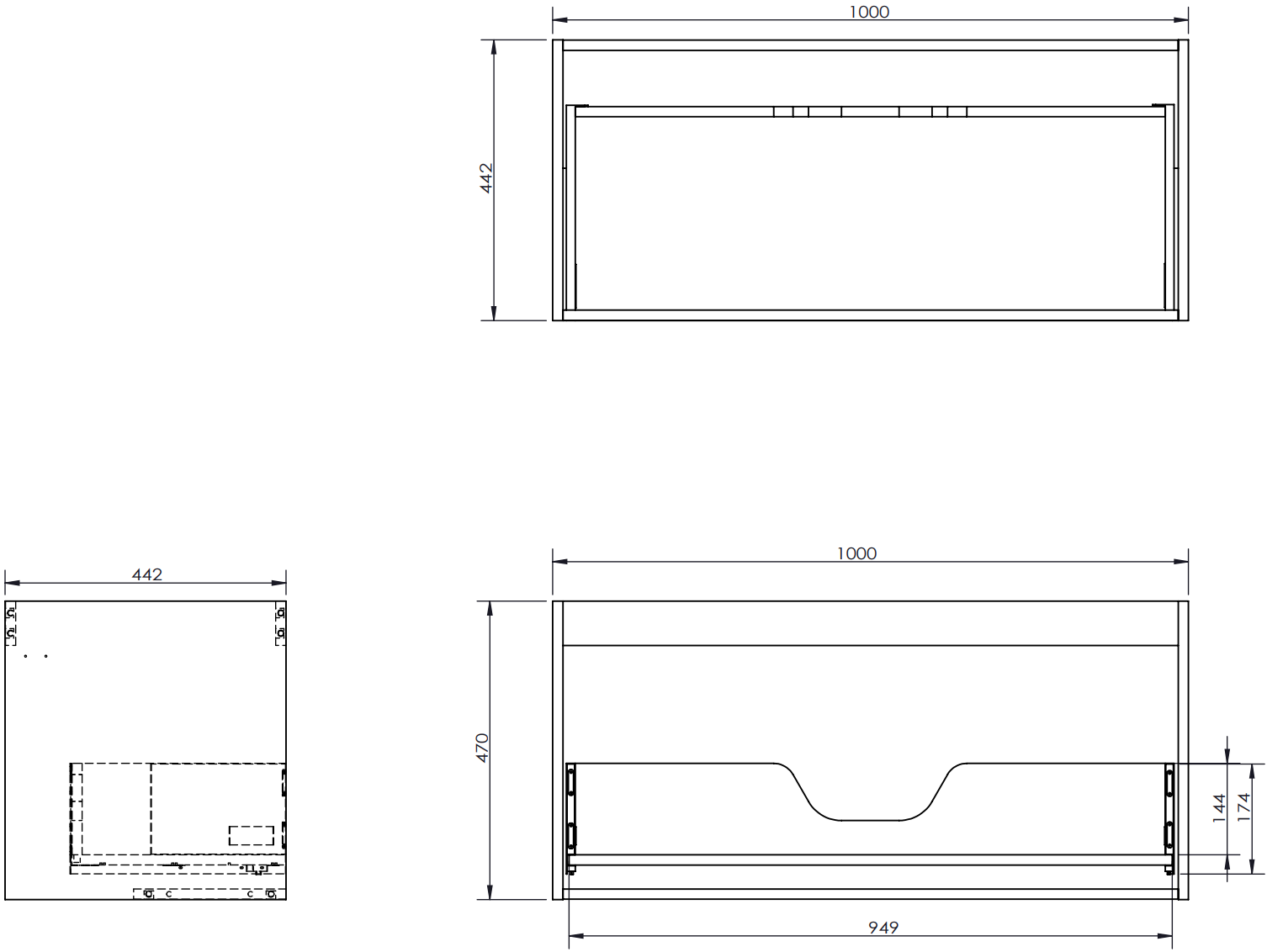 Wycięcie w szufladzie jest zaprojektowane w taki sposób, aby pomieścić syfon, który jest niezbędny w instalacjach umywalkowych. Dzięki temu mebel może być zamontowany w pełni funkcjonalnie, bez konieczności rezygnowania z przestrzeni w szufladzie na rzecz instalacji.