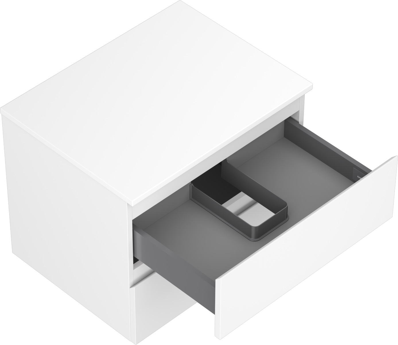 Wycięcie w szufladzie jest zaprojektowane w taki sposób, aby pomieścić syfon, który jest niezbędny w instalacjach umywalkowych. Dzięki temu mebel może być zamontowany w pełni funkcjonalnie, bez konieczności rezygnowania z przestrzeni w szufladzie na rzecz instalacji.