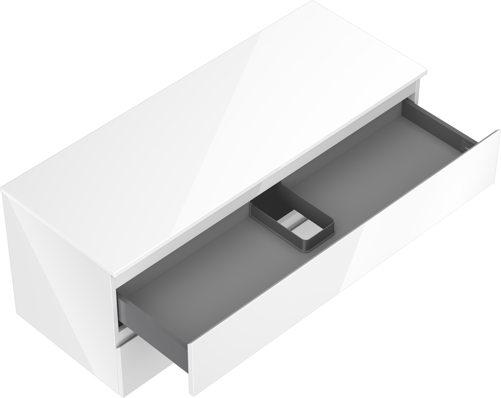 Wycięcie w szufladzie jest zaprojektowane w taki sposób, aby pomieścić syfon, który jest niezbędny w instalacjach umywalkowych. Dzięki temu mebel może być zamontowany w pełni funkcjonalnie, bez konieczności rezygnowania z przestrzeni w szufladzie na rzecz instalacji.