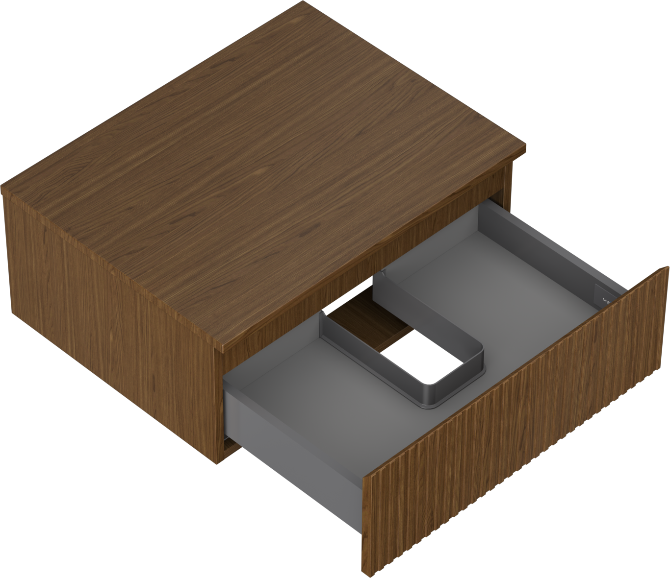 Wycięcie w szufladzie jest zaprojektowane w taki sposób, aby pomieścić syfon, który jest niezbędny w instalacjach umywalkowych. Dzięki temu mebel może być zamontowany w pełni funkcjonalnie, bez konieczności rezygnowania z przestrzeni w szufladzie na rzecz instalacji.
