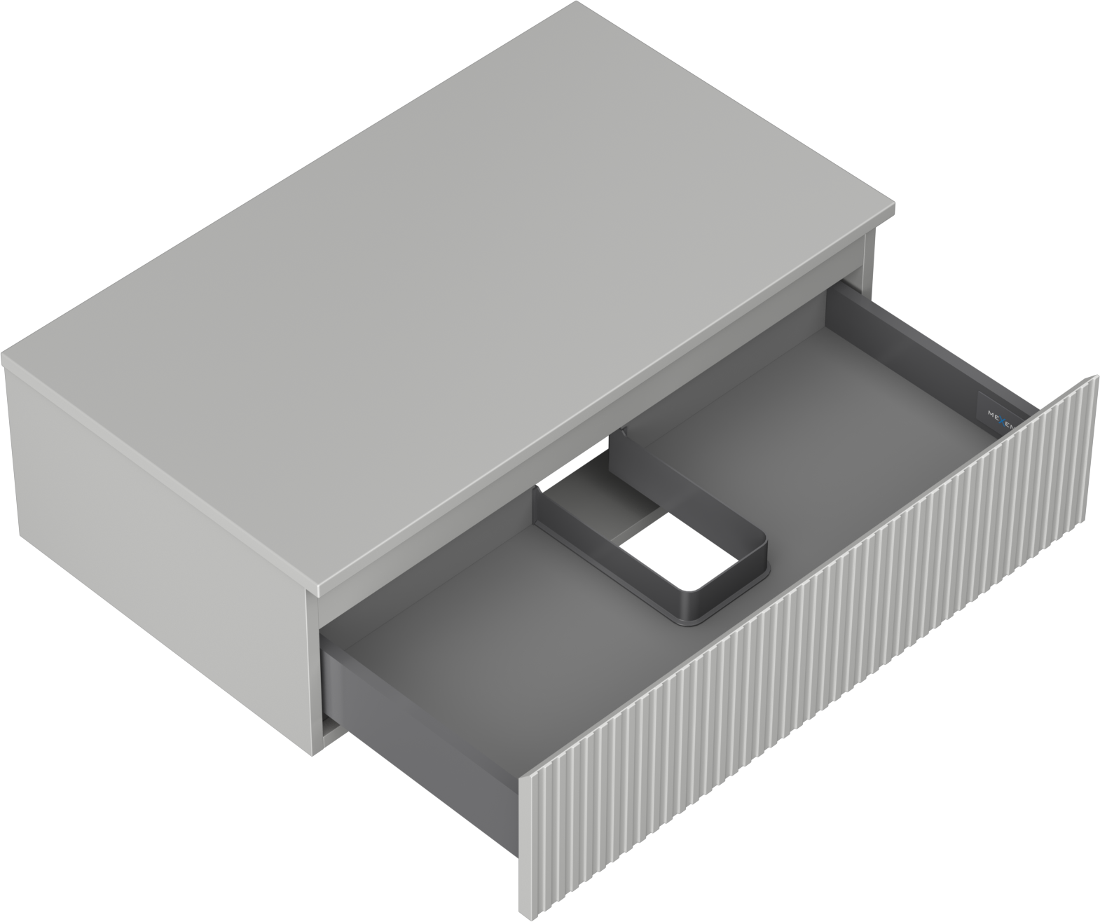 Wycięcie w szufladzie jest zaprojektowane w taki sposób, aby pomieścić syfon, który jest niezbędny w instalacjach umywalkowych. Dzięki temu mebel może być zamontowany w pełni funkcjonalnie, bez konieczności rezygnowania z przestrzeni w szufladzie na rzecz instalacji.