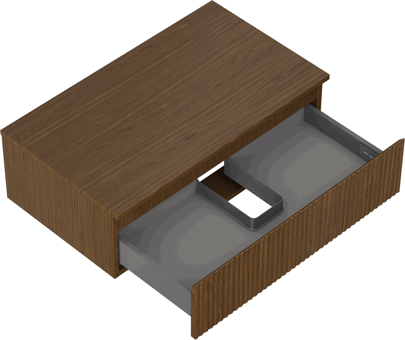 Wycięcie w szufladzie jest zaprojektowane w taki sposób, aby pomieścić syfon, który jest niezbędny w instalacjach umywalkowych. Dzięki temu mebel może być zamontowany w pełni funkcjonalnie, bez konieczności rezygnowania z przestrzeni w szufladzie na rzecz instalacji.