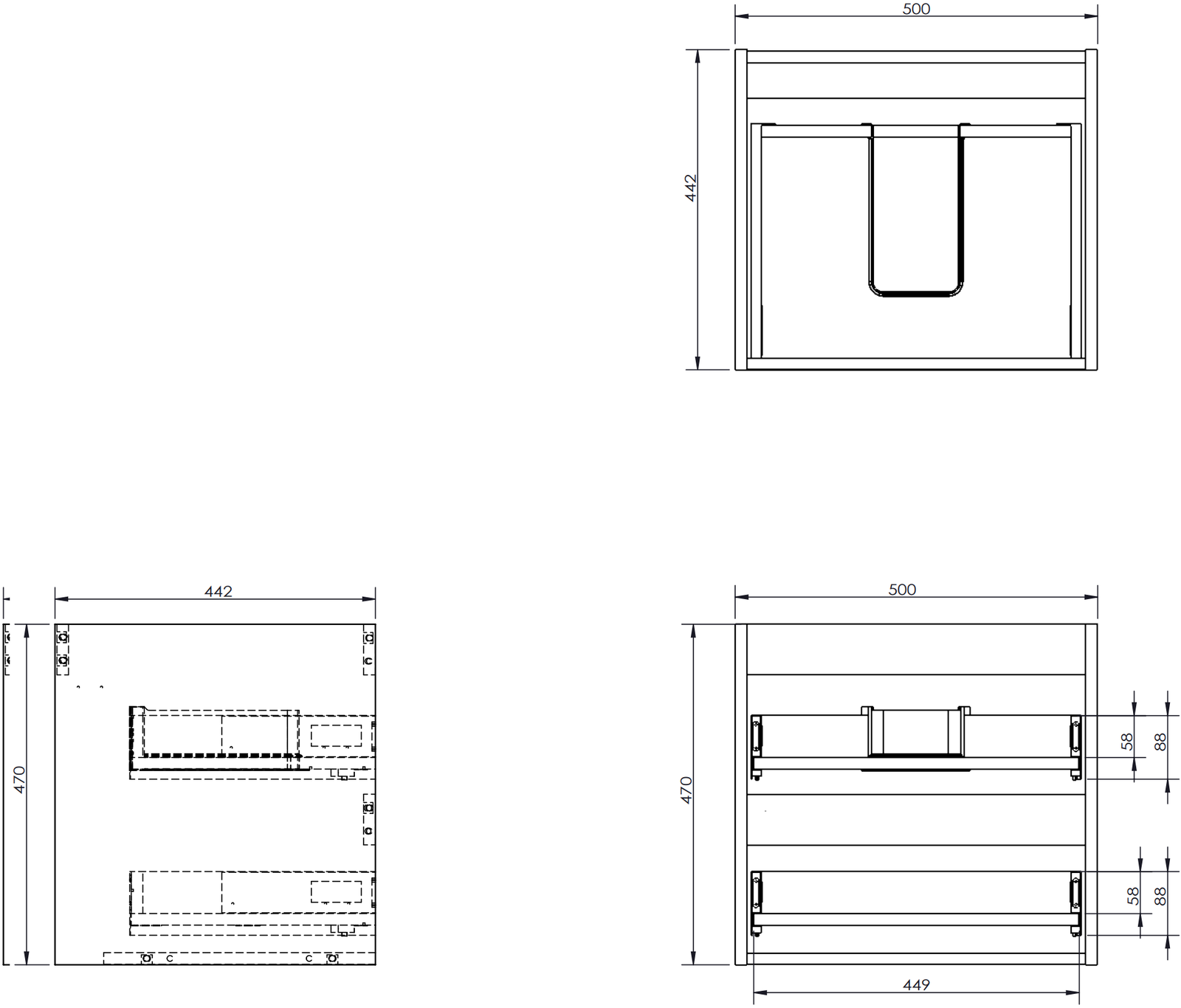Wycięcie w szufladzie jest zaprojektowane w taki sposób, aby pomieścić syfon, który jest niezbędny w instalacjach umywalkowych. Dzięki temu mebel może być zamontowany w pełni funkcjonalnie, bez konieczności rezygnowania z przestrzeni w szufladzie na rzecz instalacji.