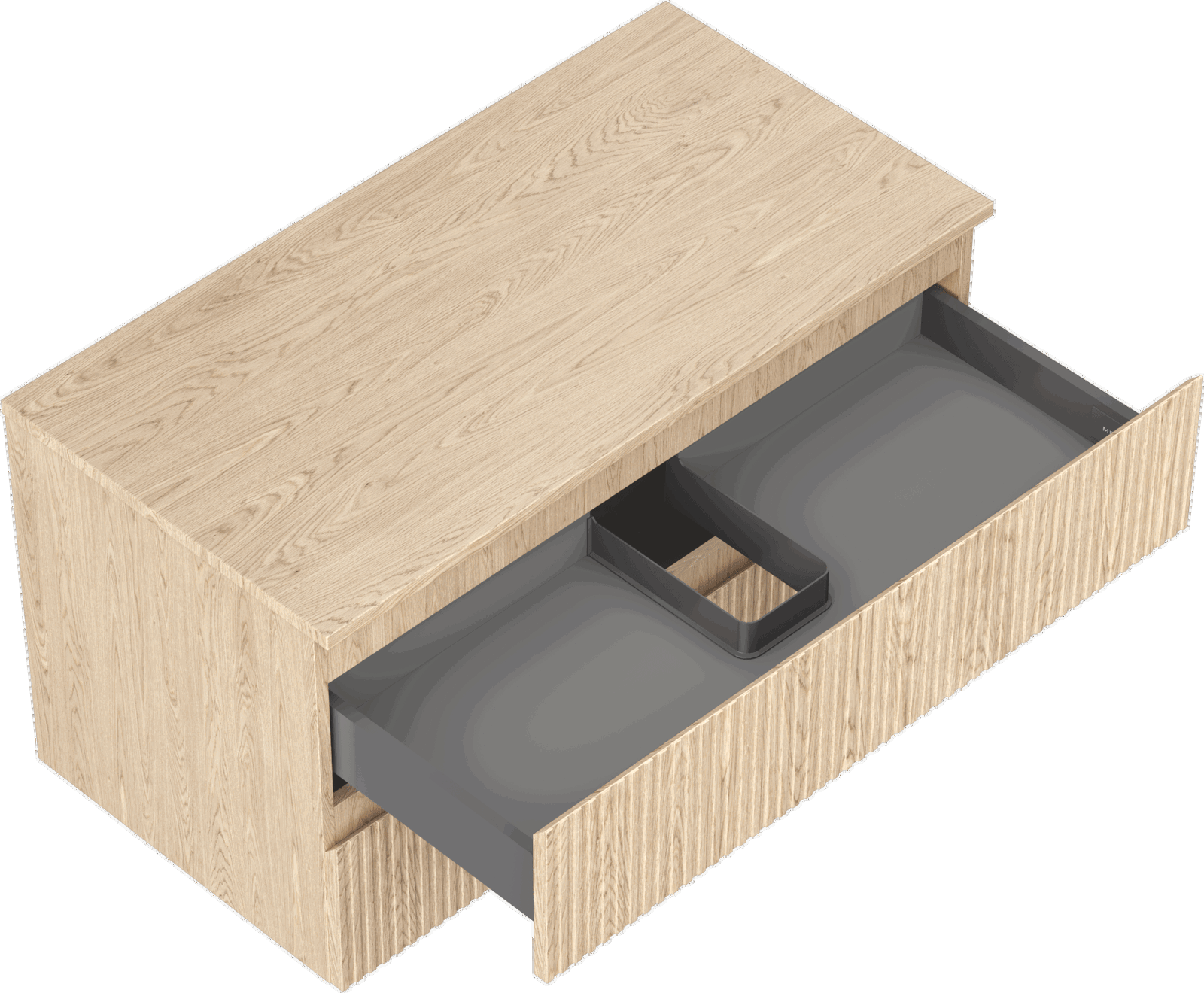 Wycięcie w szufladzie jest zaprojektowane w taki sposób, aby pomieścić syfon, który jest niezbędny w instalacjach umywalkowych. Dzięki temu mebel może być zamontowany w pełni funkcjonalnie, bez konieczności rezygnowania z przestrzeni w szufladzie na rzecz instalacji.