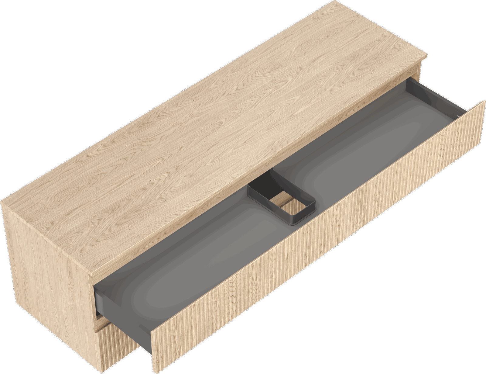 Wycięcie w szufladzie jest zaprojektowane w taki sposób, aby pomieścić syfon, który jest niezbędny w instalacjach umywalkowych. Dzięki temu mebel może być zamontowany w pełni funkcjonalnie, bez konieczności rezygnowania z przestrzeni w szufladzie na rzecz instalacji.