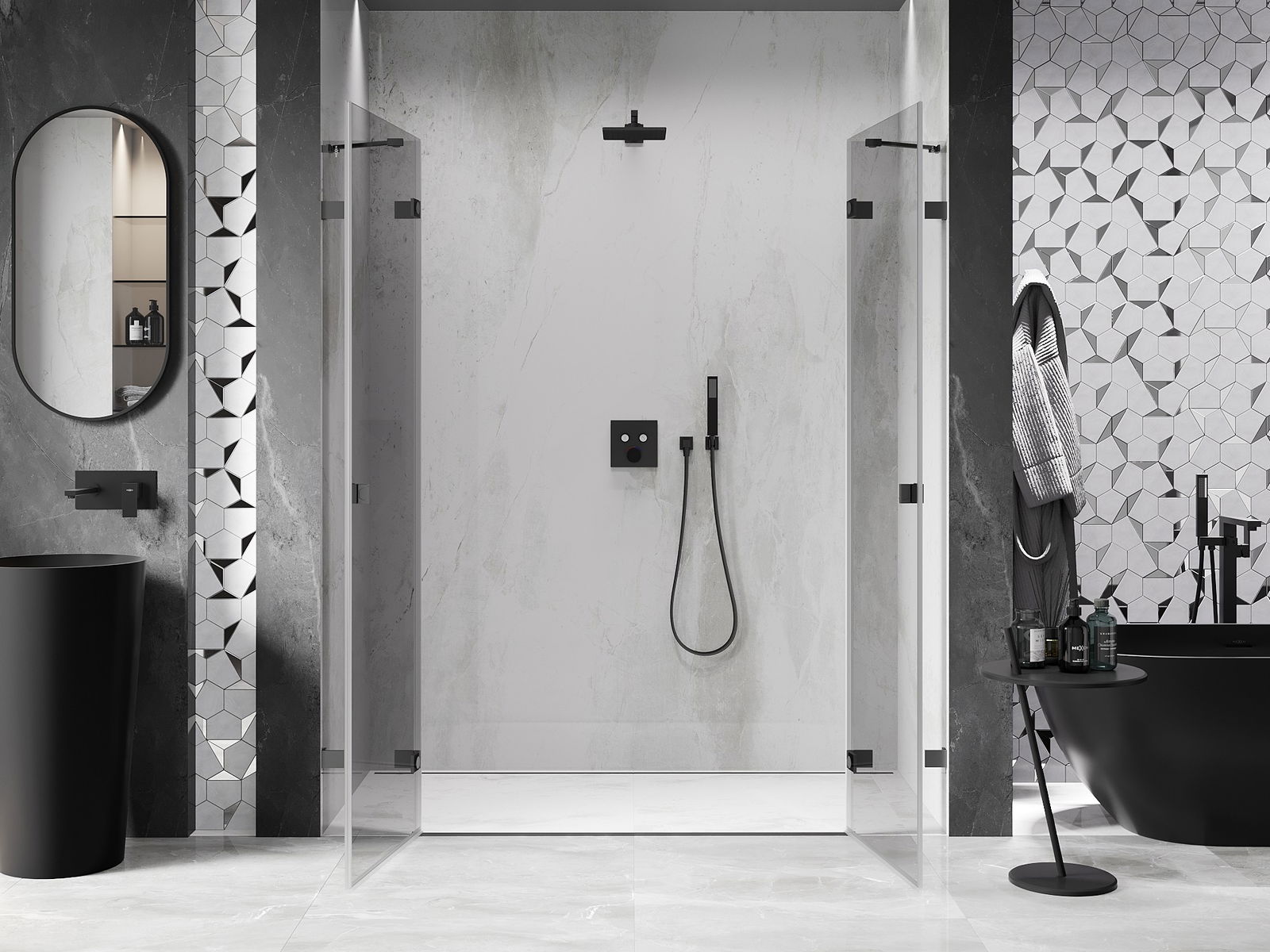 Poręczny i wygodny uchwyt został wykonany z trwałego i odpornego metalu. Modny kształt w połączeniu z wykończeniem dopasowanym do koloru profili nadaje całości nowoczesnego i stylowego wyglądu, podkreślając estetykę każdej łazienki.